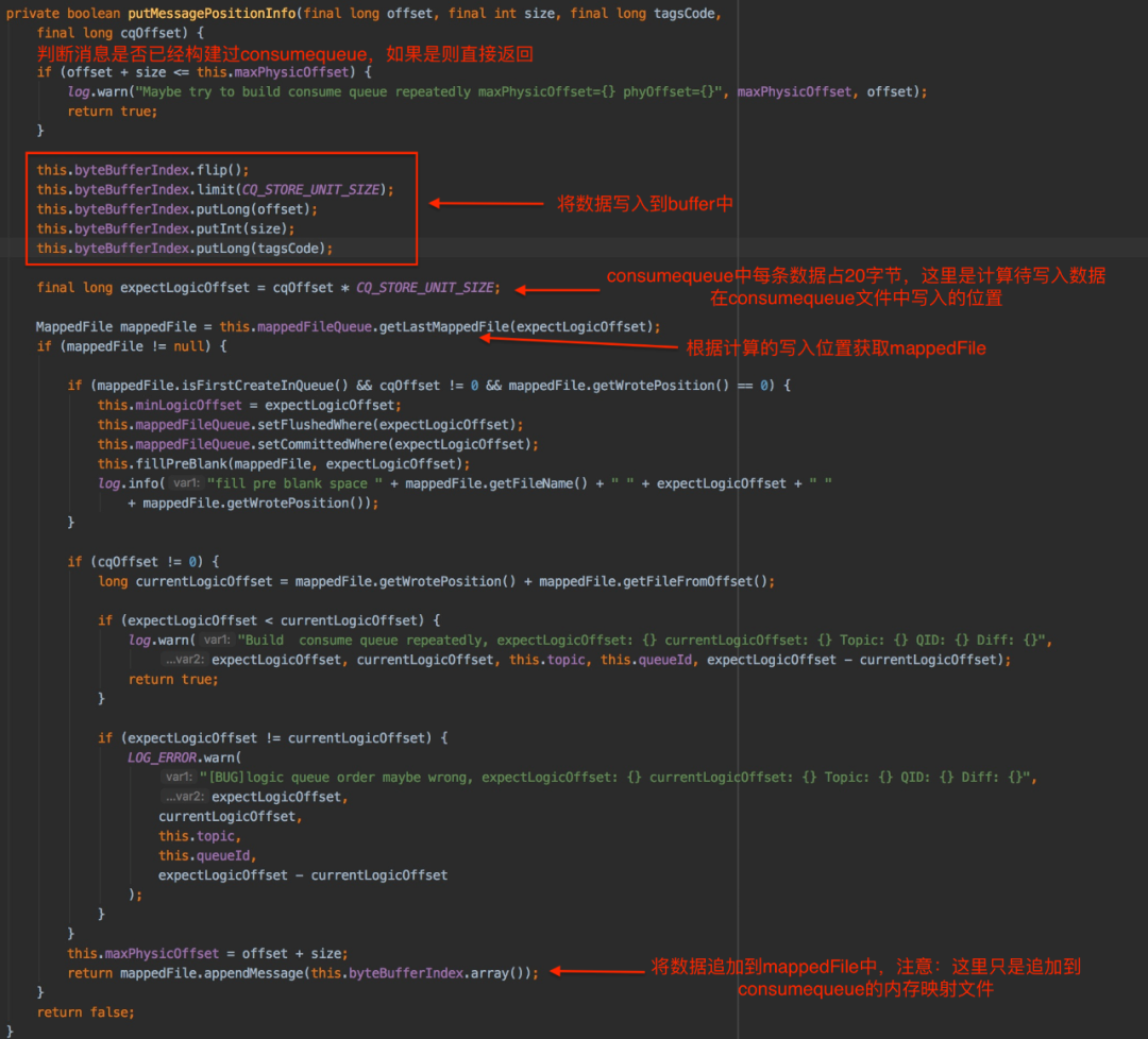 putMessagePositionInfoWrapper方法的实现中是通过putMessagePositionInfo(final long offset, final int size, final long tagsCode, final long cqOffset)方法实现追加数据到consumequeue文件的功能,具体如下: