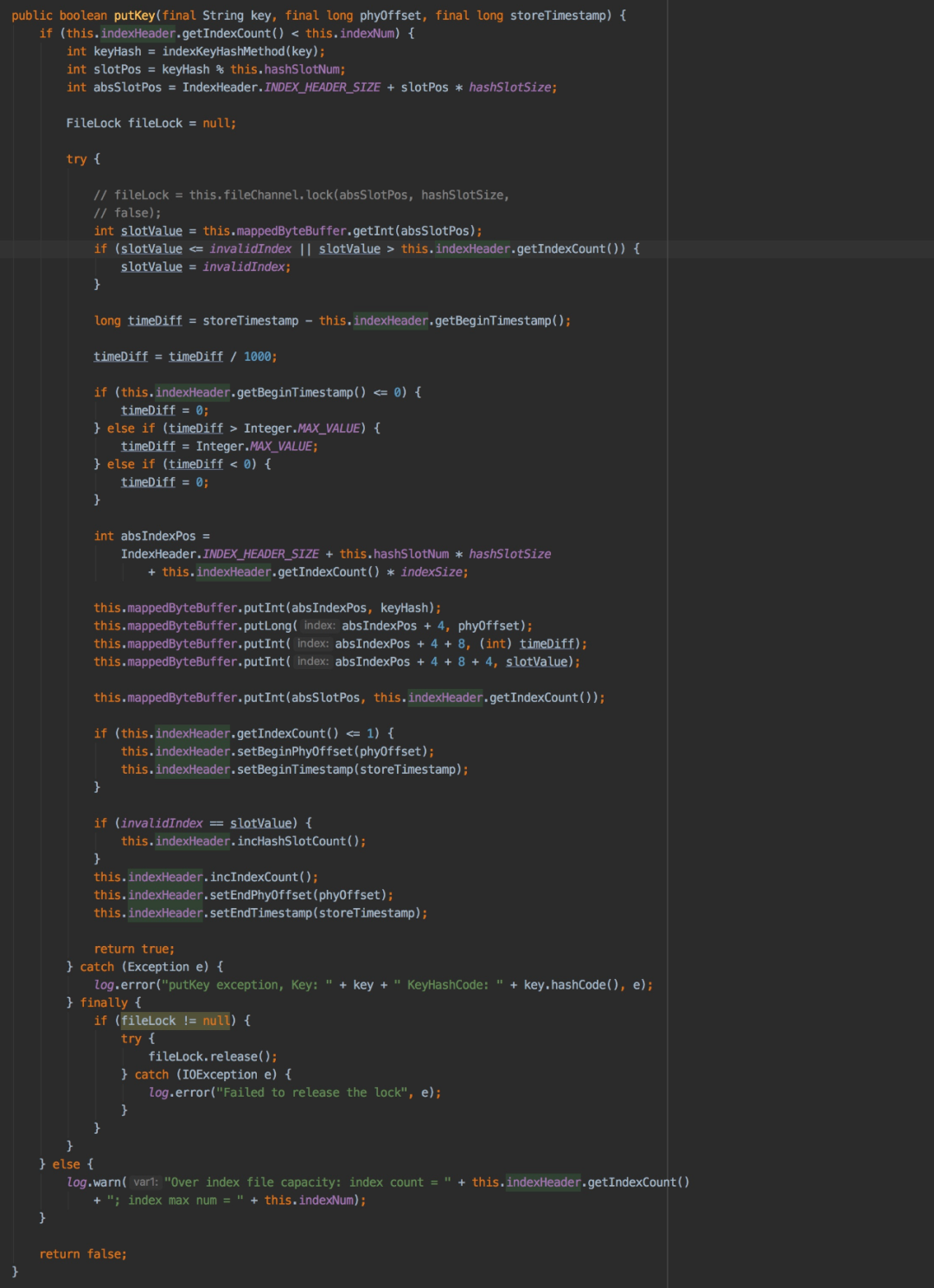下面详细分析putKey(final String key, final long phyOffset, final long storeTimestamp) 的实现逻辑,也就是如何构建索引并写入index文件中: