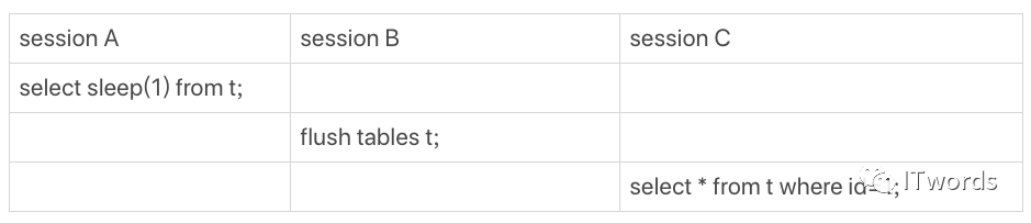 在session A中,我故意每行都调用一次sleep(1),这样这个语句默认要执行10万秒,在这期间表t一直是被session A“打开”着。然后,session B的flush tables t命令再要去关闭表t,就需要等session A的查询结束。这样,session C要再次查询的话,就会被flush 命令堵住了。
