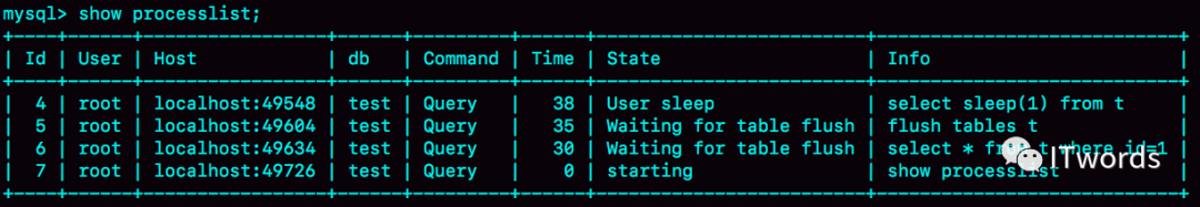 查询这个线程的状态你会发现是Waiting for table flush,意思就是等待表的关闭。