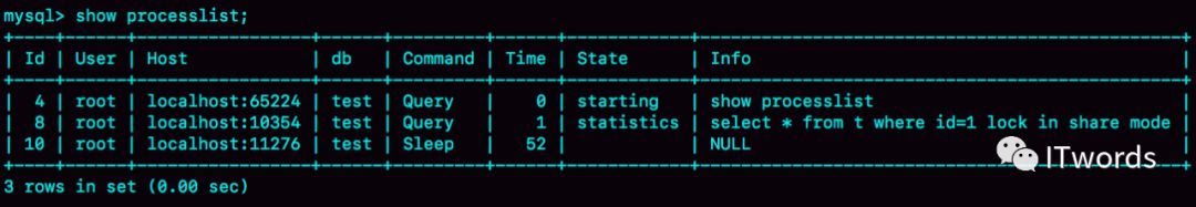 下图是这个复现步骤的show processlist结果。这个例子的排查也很简单,你看到这个show processlist的结果,肯定就知道应该怎么做了。