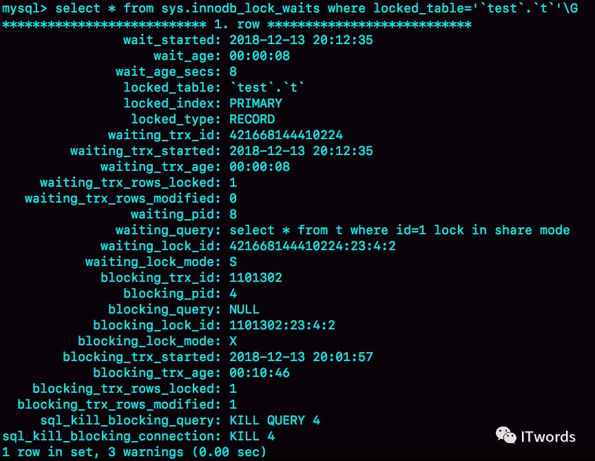 select * from t sys.innodb_lock_waits where locked_table=`'test'.'t'`