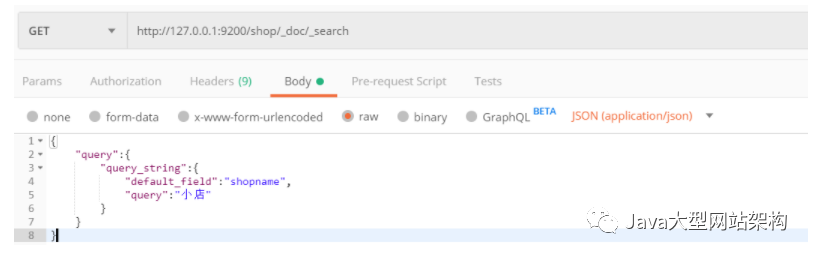 请求url http://127.0.0.1:9200/shop/doc/search (索引/"doc"/"search")