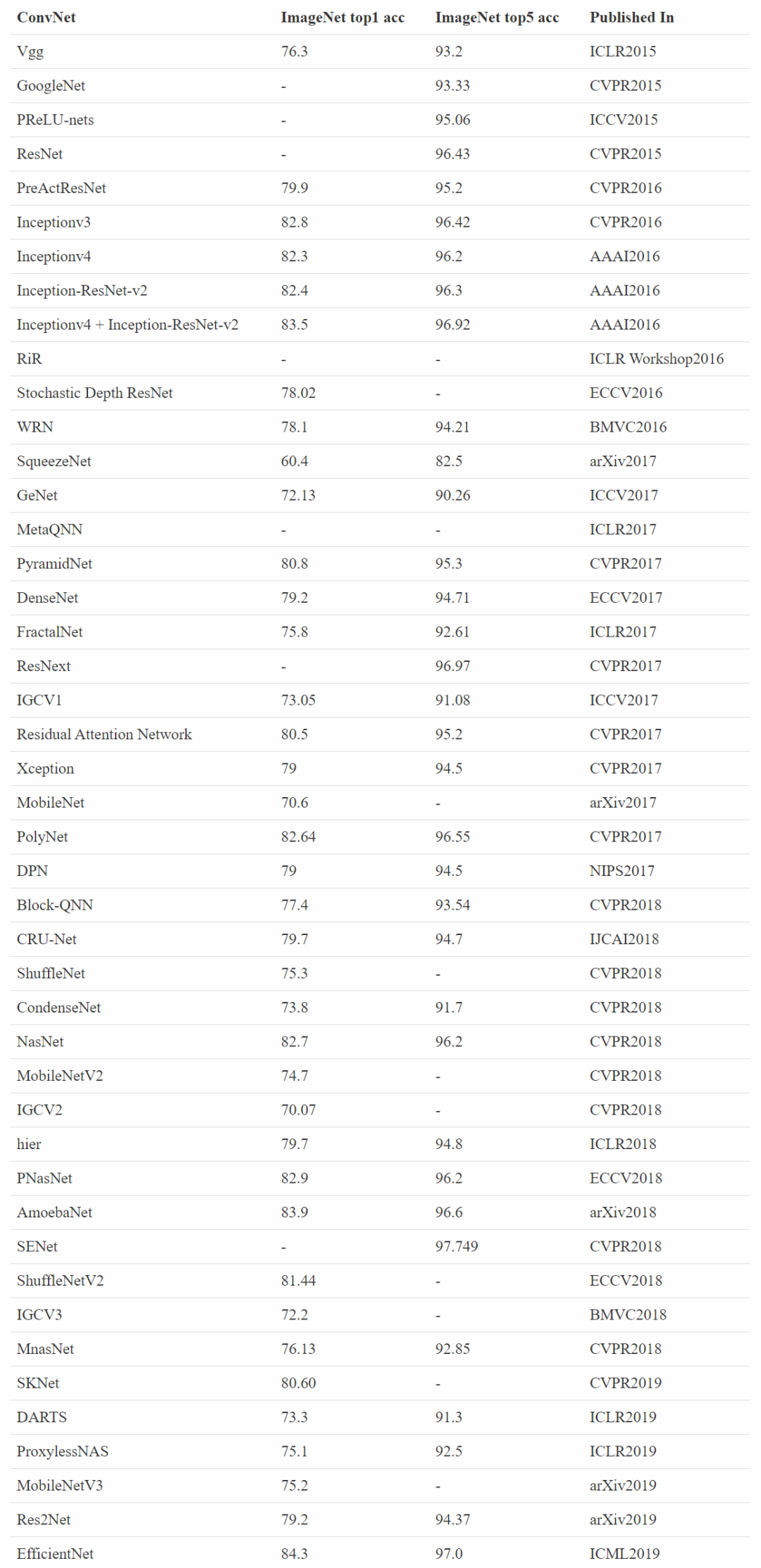注意:论文列出了ImageNet的top1和top5精确度。这并不一定意味着一个网络比另一个当acc较高,导致一些网络是专注于降低模型的复杂性,而不是提高准确性,或者一些文件只在ImageNet给单一的实验结果,但别人给模型融合或multicrop结果。