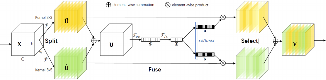 Split 操作是指对特征向量 X 进行不同卷积核大小的卷积操作(包括 efficient group/depthwise conv, BN, ReLU,不同卷积核大小可考虑使用空洞卷积)得到输出 \hat U 和 \widetilde{U}。
