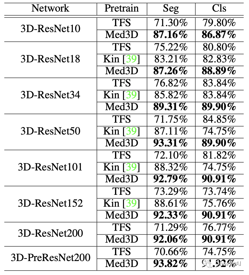 设计了一个3D网络(Med3D),共同训练多种训练数据,产生了3D-ResNet系列预训练模型,可作为backbone用于分割、检测和分类任务。