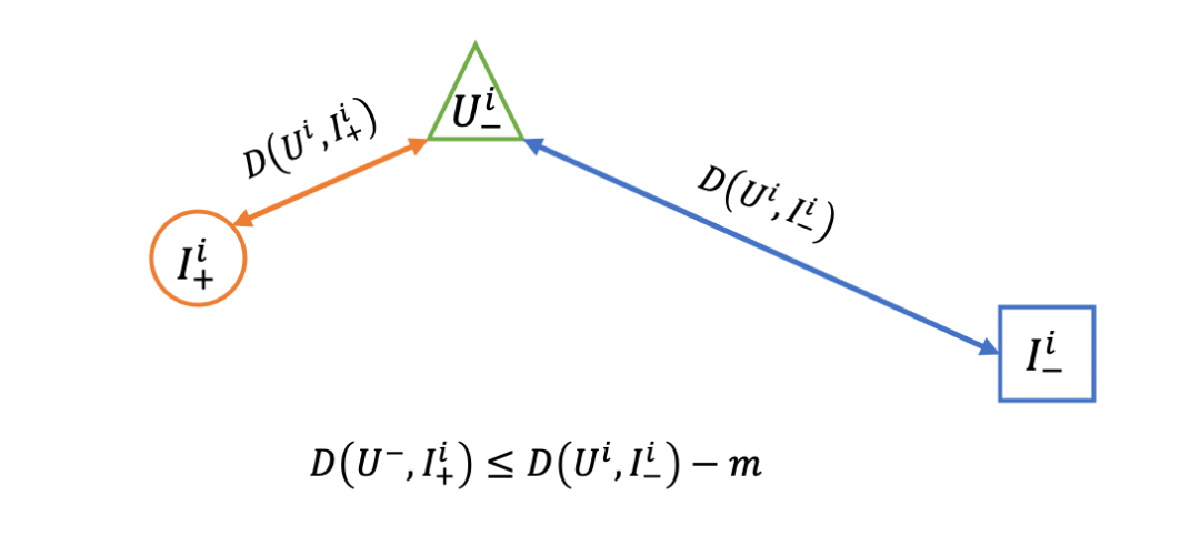 对于三元组输入样本,其中、和分别表示第组样本中的User、正Item和负Item。Pairwise Hinge Loss目标使User与负Item的距离比User与正Item距离大于: