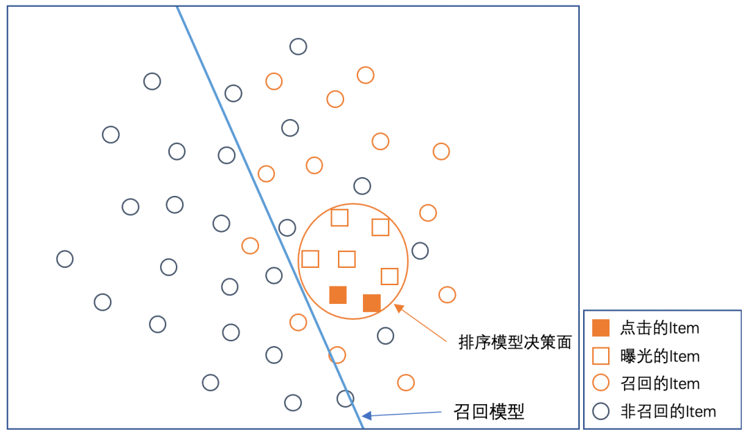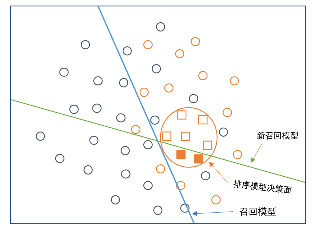 以二维空间样本为例,蓝色直线为召回模型决策面,黄色圆圈为排序模型决策面(p.s. 召回模型复杂度比排序模型低),最终用户看到的是被排序模型选中的样本(简单起见,忽略了后续的重排层的影响)。