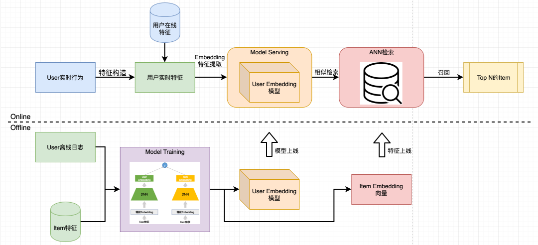 模型训练完成后,Item的Embedding()是可以离线计算并保存为Item词表,线上部署到ANN模块中。线上应用时,只需实时计算 User Embedding(即用户+上下文特征),然后通过ANN模块来实现快速召回用户偏好的候选集。