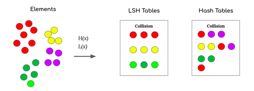 如下图所示,在空间中相近的点被LSH后,有更大概率得到相同的哈希值。