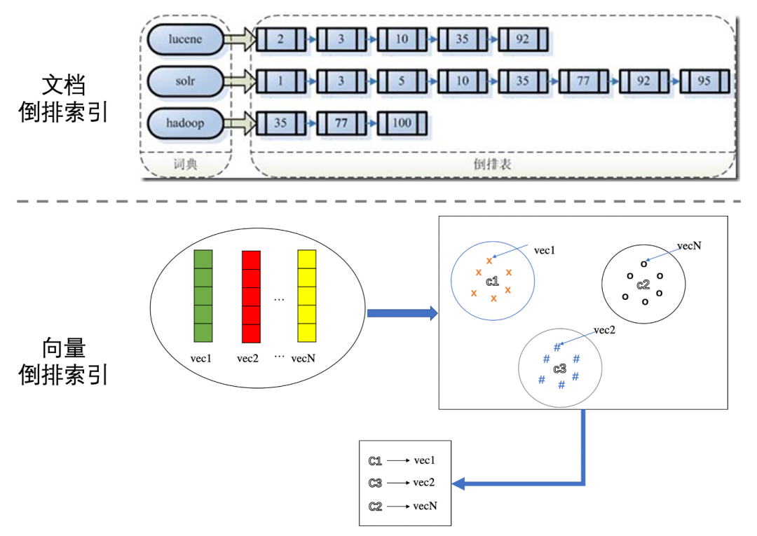 在相似检索中,向量的倒排索引是通过聚类方法把整个向量空间划分为k个子区域,每个区域用中心点c表示。在索引构造阶段,只需要与中心点进行对比,将其归属到距离最近的中心点对应的倒排中。如下图所示: