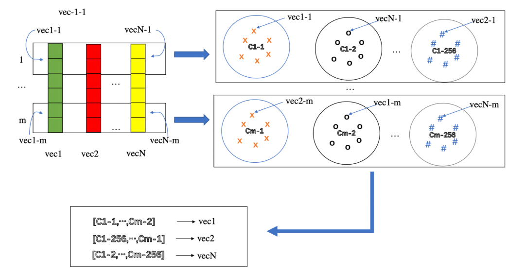 PQ的原理是将向量空间按维度划分成若干个子空间,然后在每个子空间中采用聚类方法得到N个中心点,最后在各子空间中用向量倒排来表示每个样本,如下图所示:
