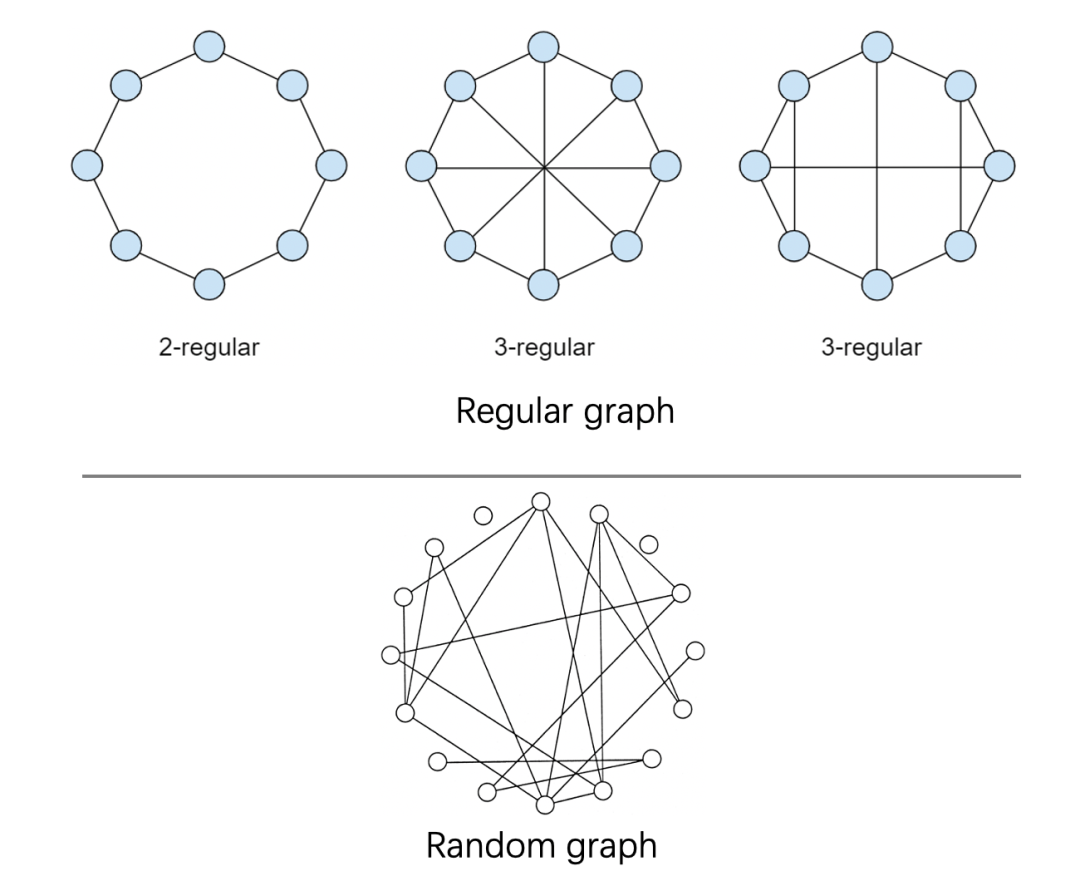 Regular graph指的是每个顶点都有相同数目的邻居的图(每个节点具有相同的度)。在regular graph中,当集聚系数(Clustering coefficient)接近饱和时,集聚系数较高,路径较短,顶点的度较高。 Random graph指的是每个顶点的邻居数是随机的(即顶点之间的连接是随机建立的)。在random graph中,顶点的集聚系数较低,顶点的度较低。