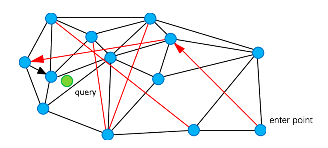 理解了Small world graph之后,Navigable small world的原理就很简单了:通过构建一个small world graph,从图中随机选择一个起始顶点,逐个遍历其邻接节点,选择与目标最近的顶点继续遍历,直到找到最近的顶点。