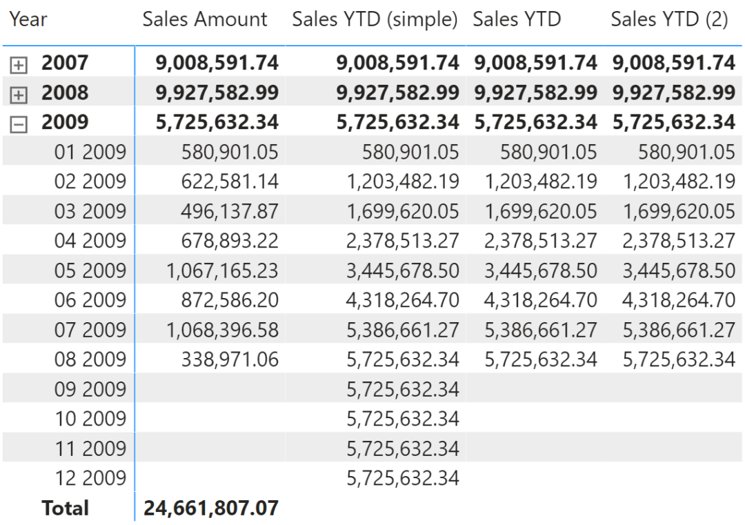 Sales YTD (simple) :=CALCULATE ([Sales Amount],DATESYTD ( 'Date'[Date] ))