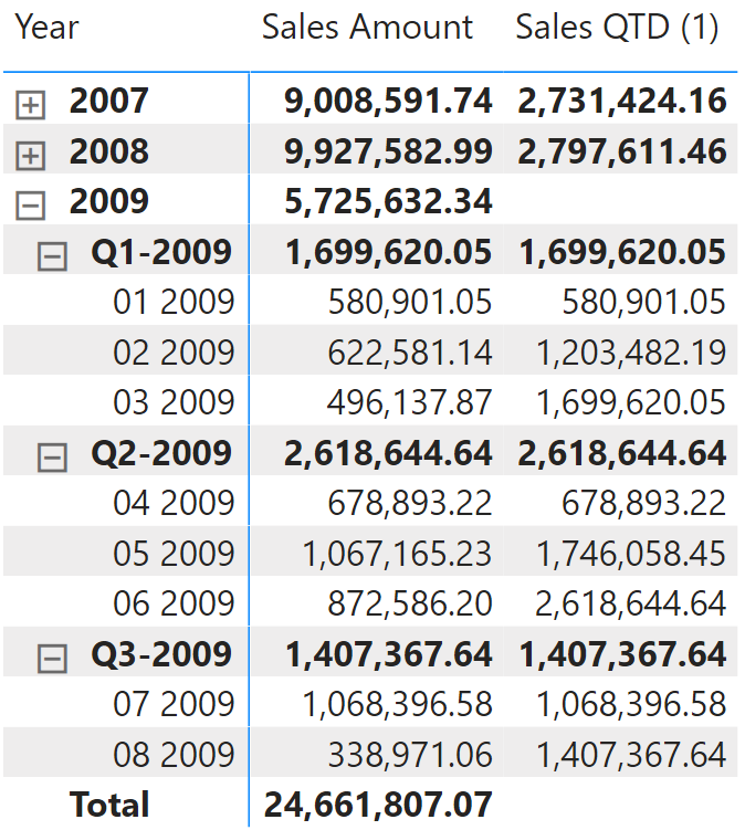 Sales QTD =IF.EAGER (AND (HASONEVALUE ( 'Date'[Month] ),[ShowValueForDates]),CALCULATE ([Sales Amount],DATESQTD ( 'Date'[Date] )))