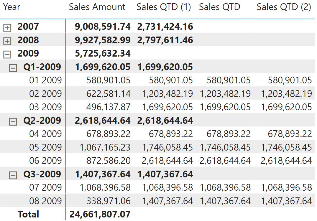 Sales QTD (1) :=IF.EAGER ([ShowValueForDates],CALCULATE ([Sales Amount],DATESQTD ( 'Date'[Date] )))