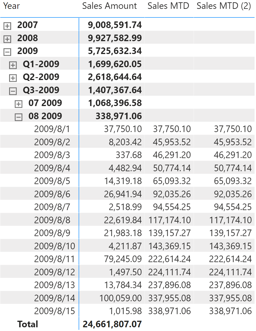 Sales MTD =IF.EAGER (AND (HASONEVALUE ( 'Date'[Date] ),[ShowValueForDates]),CALCULATE ([Sales Amount],DATESMTD ( 'Date'[Date] )))