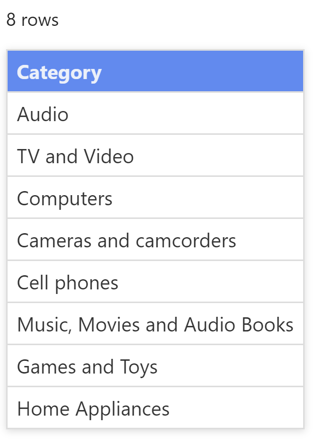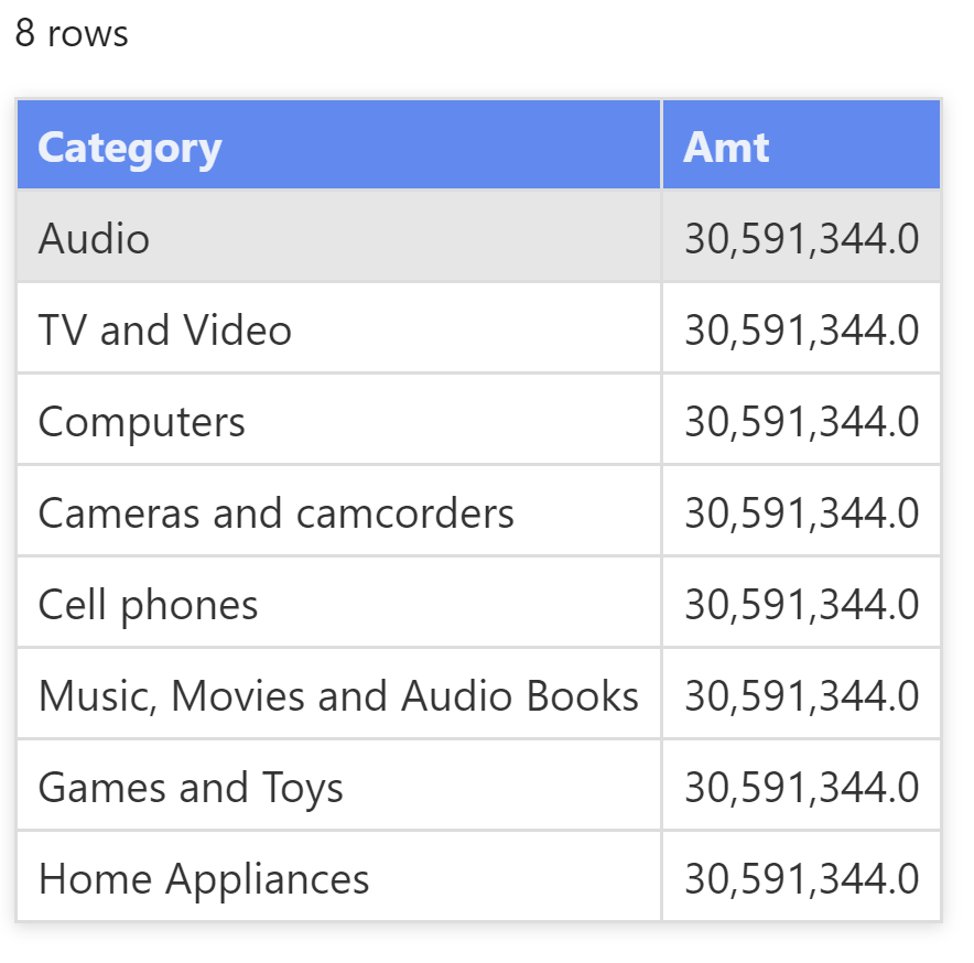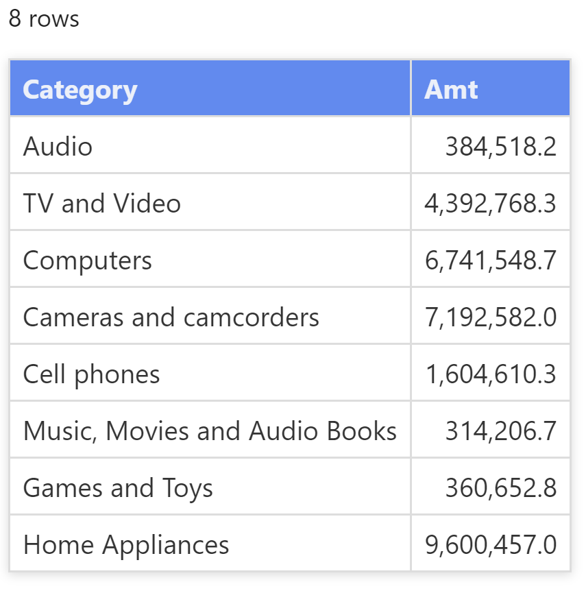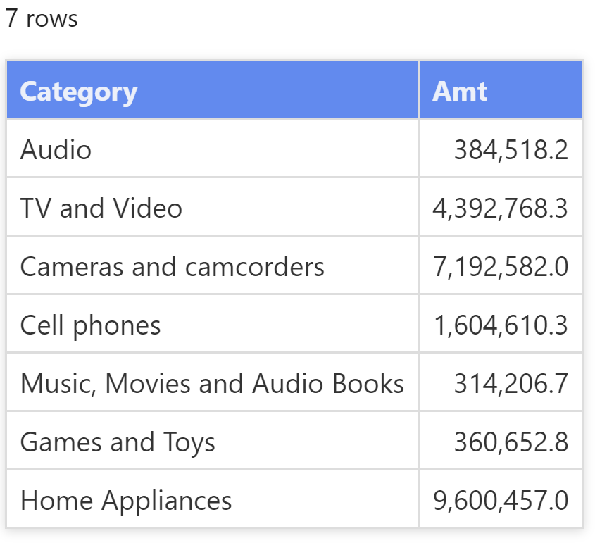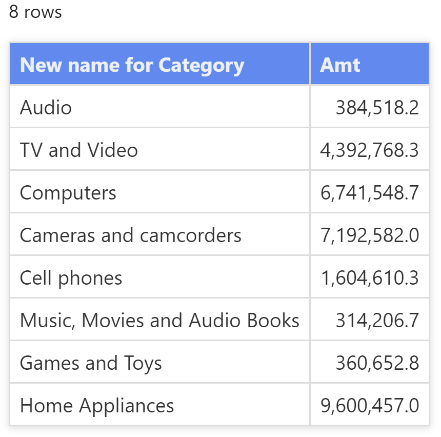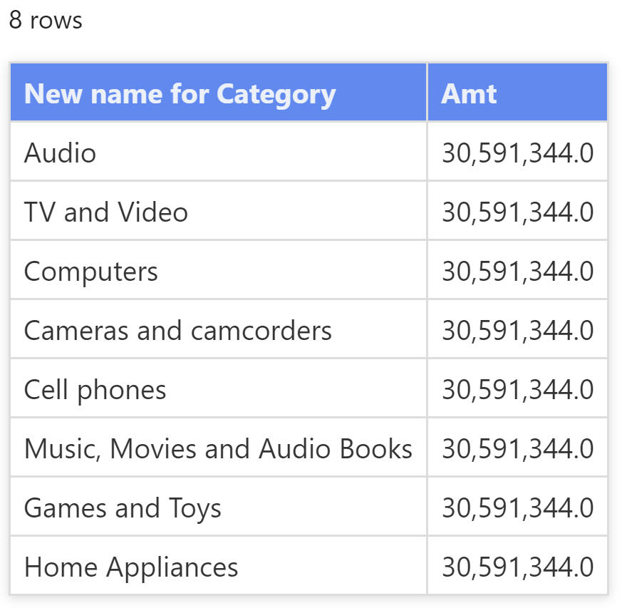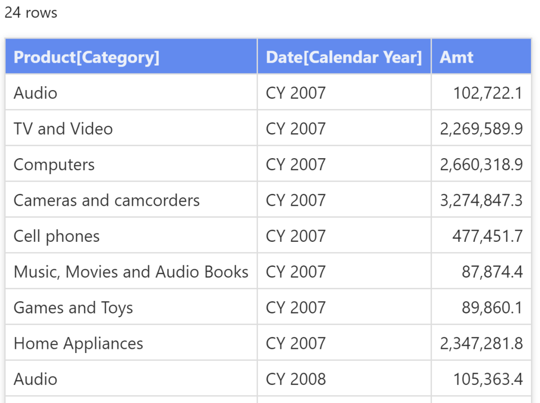 EVALUATEVAR Categories =DATATABLE ("Category", STRING,{{ "Category" },{ "Audio" },{ "TV and Video" },{ "Computers" },{ "Cameras and camcorders" },{ "Cell phones" },{ "Music, Movies and Audio Books" },{ "Games and Toys" },{ "Home Appliances" }})RETURNADDCOLUMNS ( Categories, "Amt", [Sales Amount] )