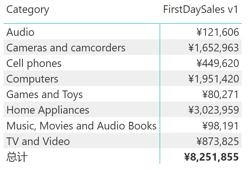 由 FirstDaySales 度量值产生的结果显示了每个品牌的首日销售额。