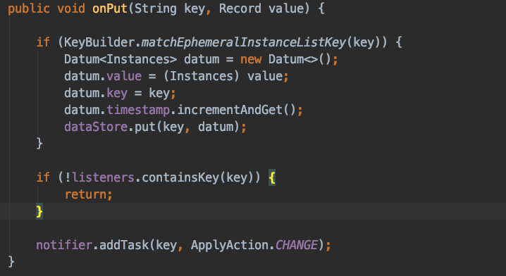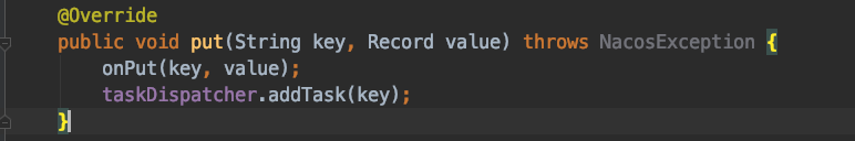 虽然我们说的是AP,但是其实我们还是需要保证最终一致,防止长时间各个节点数据不一致,在DistroConsistencyService的Put方法中会对TaskDispatcher添加一个任务,如下图: