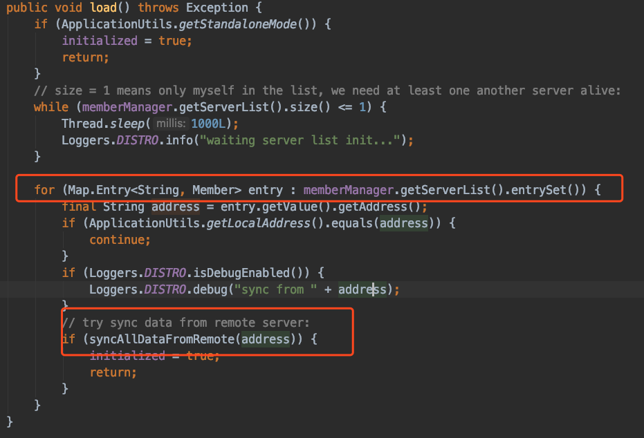 在DistroConsistencyService的load方法中,我们遍历所有的非自己的Server,然后将数据进行同步,如果其中某一个同步成功了,那就不需要向其他的Server发出同步信息,。这样就可以将数据全部恢复。