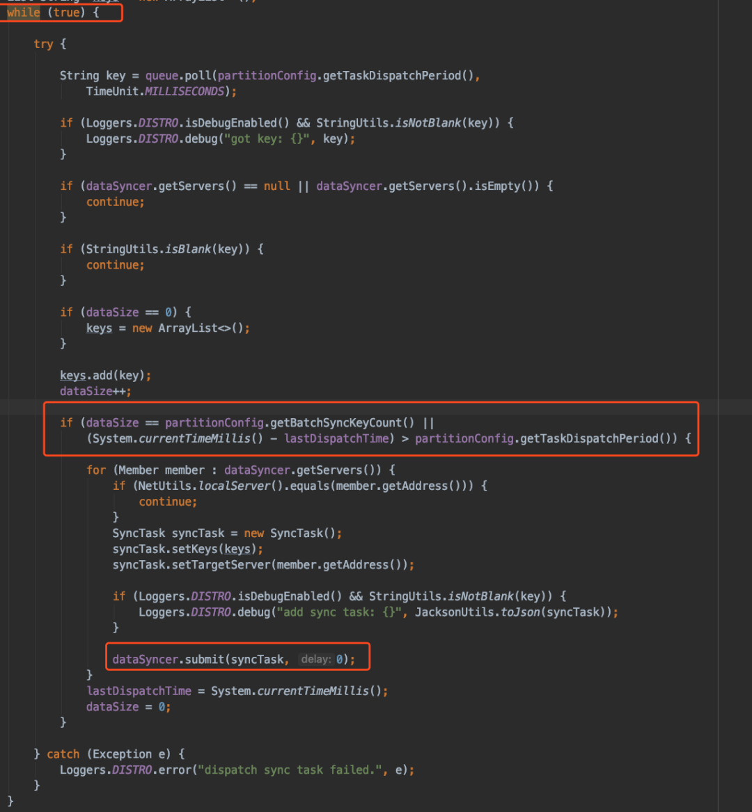 其核心逻辑就是上面的whie循环,主要看我标红的代码,这里并不是来一个更新就发送一个,如果服务的变更比较频繁,如果来一个发送一个效率必然很低,所以在这里采取了一个合并的策略,如果更新的数据达到一定的数量这里默认是1000,或者说距离上一次发送已经超过了一定的时间这里默认是2s,都会进行一个发送,这里的发送也是生成一个SyncTask然后放到线程池中进行异步发送。