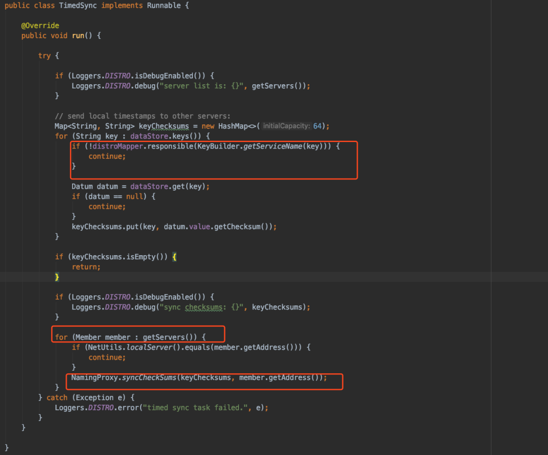 这个时候有同学会问,如果我某个机器刚刚上线,刚好没有收到更新的这个数据这个怎么办呢?在Nacos中也会有一个兜底的策略TimedSync,这个任务每5s会执行一次,具体的执行任务代码如下: