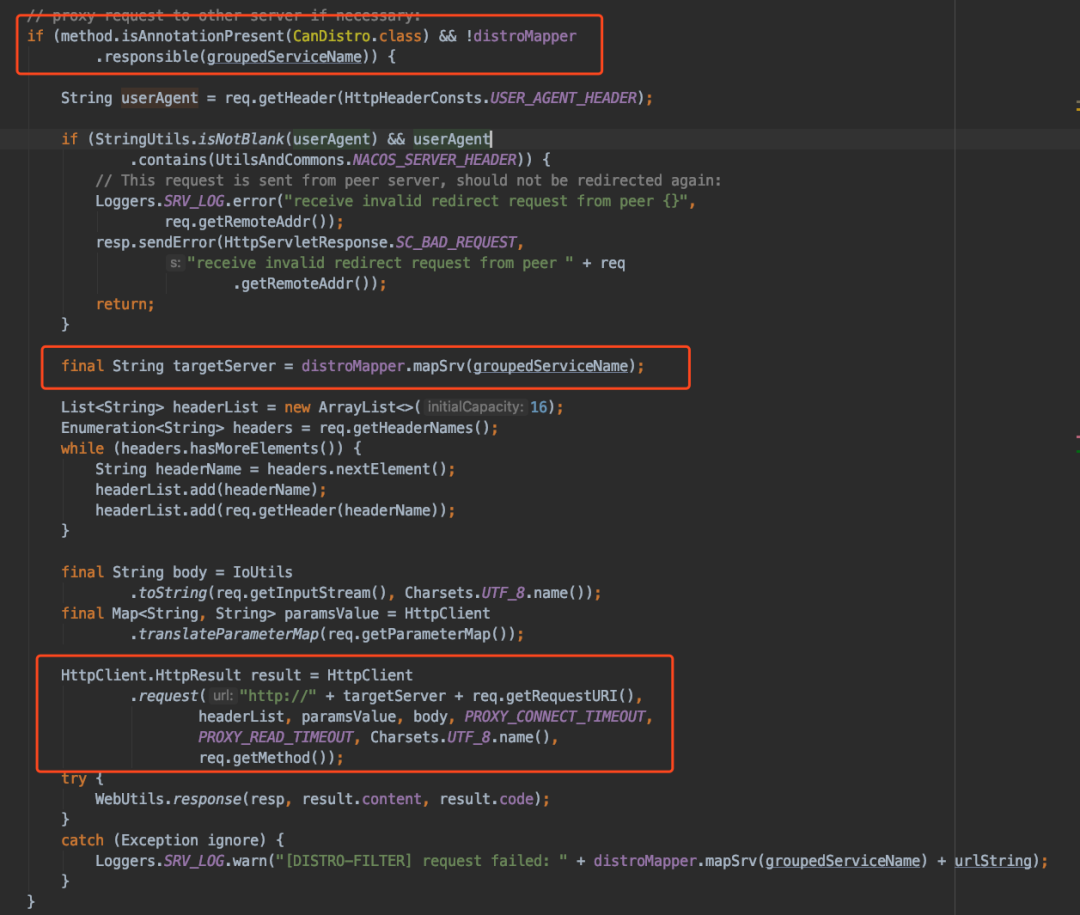 在Distro中并不是每个节点都可以处理所有的读请求,但是写请求并不是每个节点都可以处理的,每个节点会根据key的hash值来判断是否应该是自己处理。写请求访问的是域名这个是会随机打到每个节点上的,Nacos是怎么做到让这些写请求打到对应的机器上呢,这个答案就在DistroFilter中: