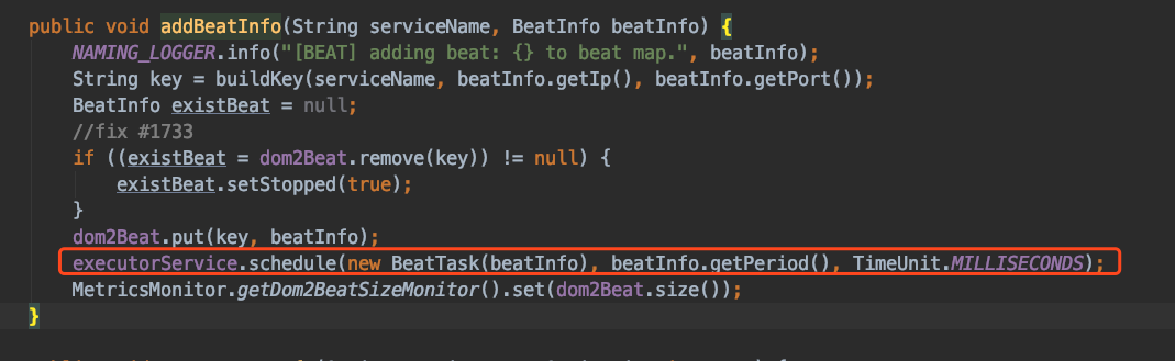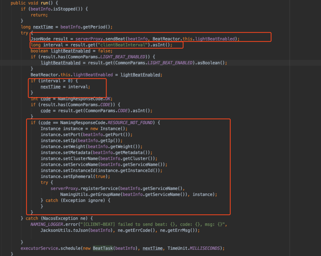 BeatTask中,首先会向Nacos-Server发送心跳,如果Nacos-Server定义了心跳的间隔接下来就会根据返回的结果修改下一次执行的时间,如果我们的服务不存在,那么说明我们的机器因为某种原因没有同步心跳,导致已经被摘除了,这里需要再次注册这个节点。