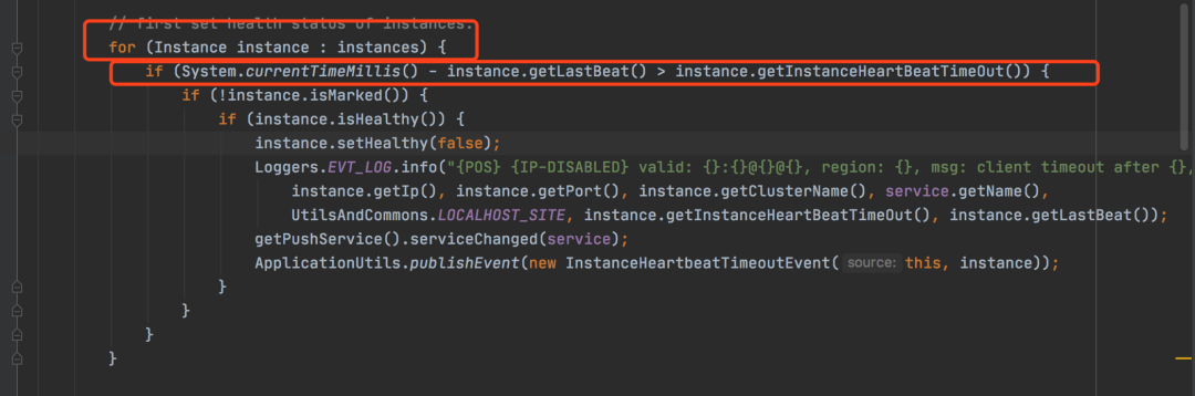 在Nacos-Server的ClientBeatCheckTask中,我们会根据Service维度,定时去扫描Service下是否有长时间没有同步的实例,默认是15s,如下面的红框中的代码:
