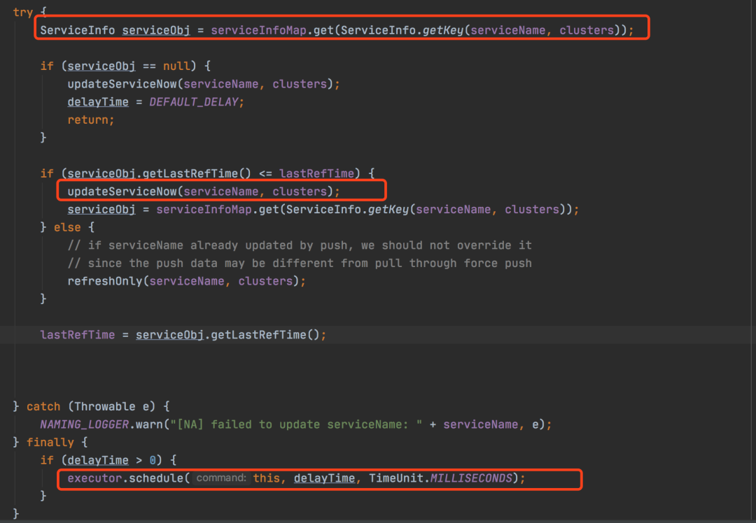 注意看上面的红框中,我们会根据Service维度去定时轮训,我们的ServiceInfo,然后去更新。