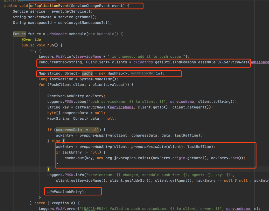 我们再来看下,Nacos是如何实现推送功能的,Nacos会记录上面我们的订阅者到我们的PushService, 下面是我们的PushService中的推送核心代码: