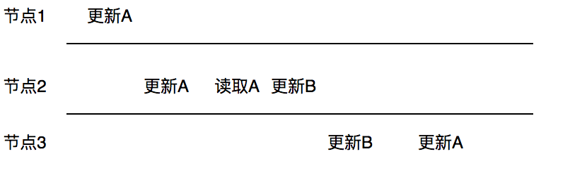 举个简单的例子如果节点1更新了数据A,节点2读取数据A,并更新数据B,这里的数据B有可能是根据数据A计算出来的,所有具备因果关系,但是如果节点3看到的是先更新的B,再更新的A那么就破坏了因果一致性。