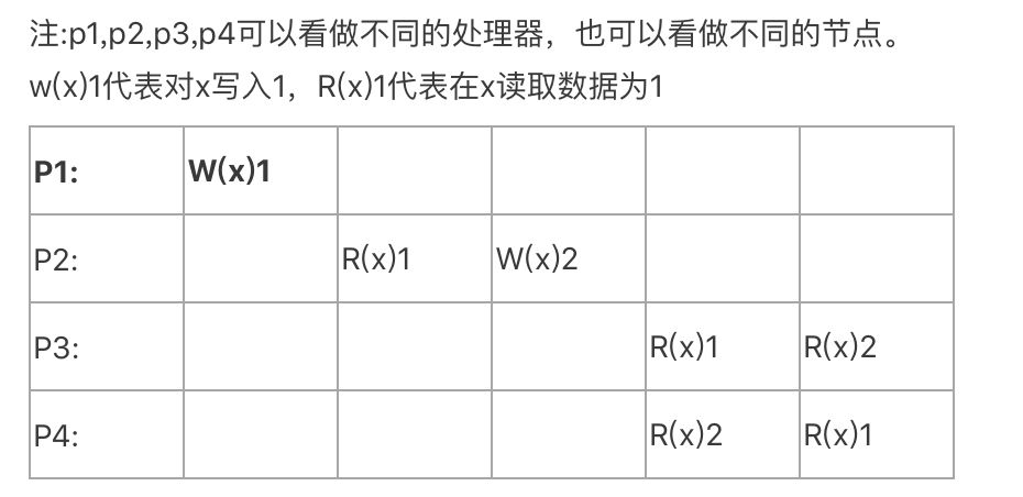 这里我们还需要注意的是这个并不总是用于分布式系统中的,在我们单个机器中如果有多核处理器,我们再任意时刻访问不同处理器对同一变量数据都需要是一致的也可以同样适用。