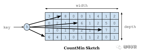 首先要说到的就是频率记录的问题,我们要实现的目标是利用有限的空间可以记录随时间变化的访问频率。在W-TinyLFU中使用Count-Min Sketch记录我们的访问频率,而这个也是布隆过滤器的一种变种。如下图所示: