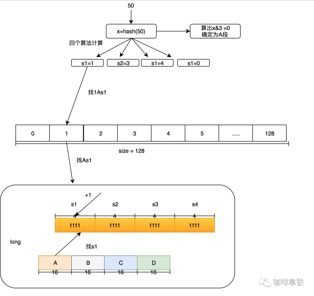 对50的hash再用其他hash算法再做一次hash,得到long数组的位置,也就是在长度128数组中的位置。假设用s1算法得到1,s2算法得到3,s3算法得到4,s4算法得到0。