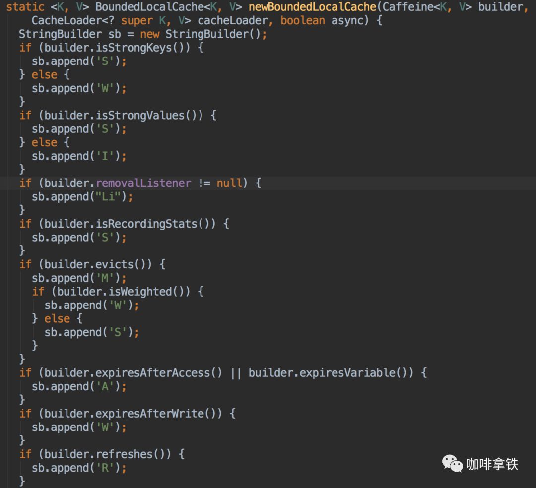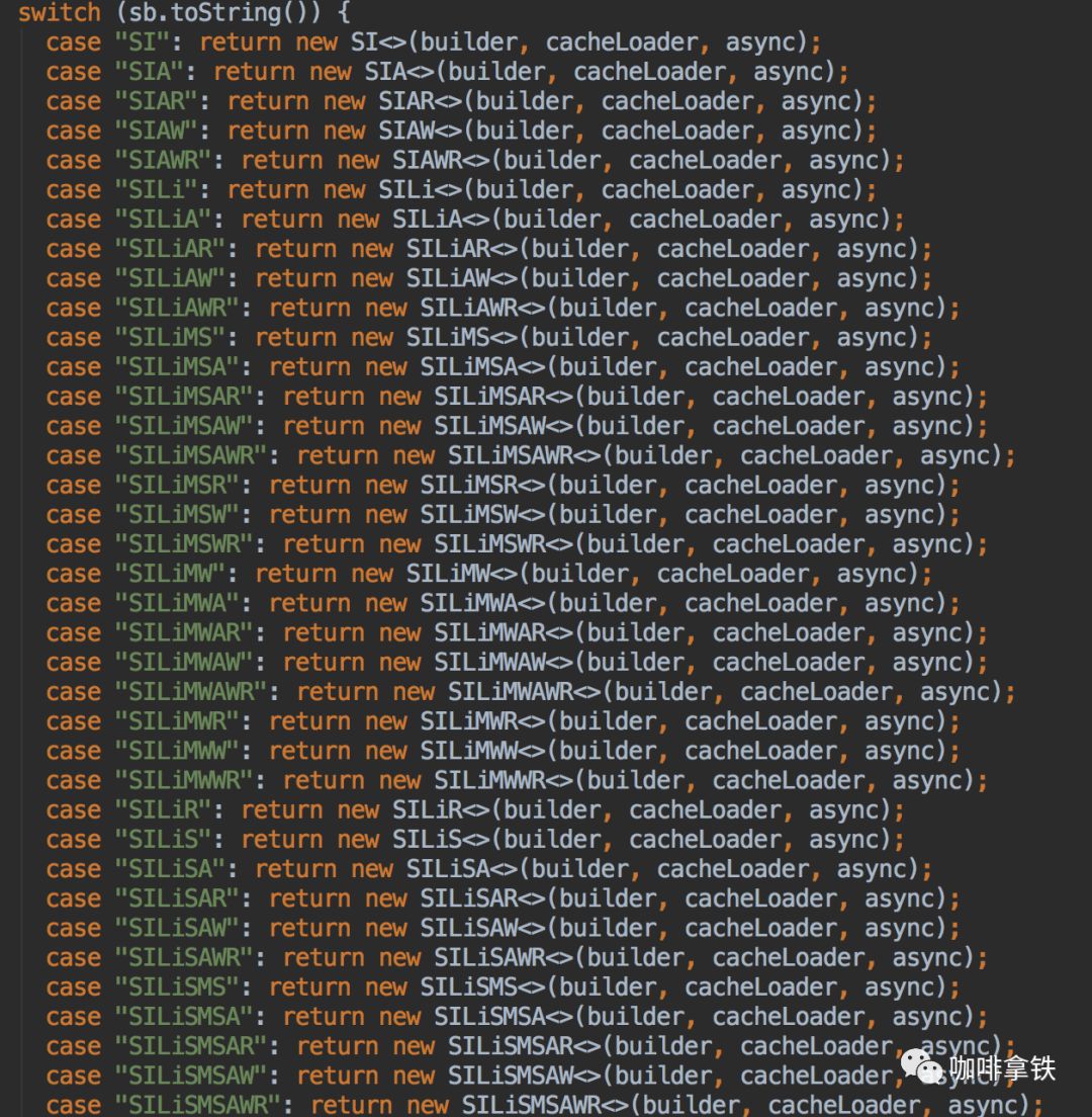 可以看见他会根据你是否配置了过期时间,remove监听器等参数,来进行字符串的拼装,最后会根据字符串来生成具体的Cache,这里的Cache太多了,作者的源码并没有直接写这部分代码,而是通过Java Poet进行代码的生成: