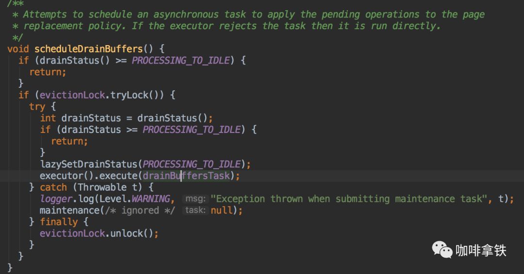 首先他会进行加锁,如果锁失败说明有人已经在执行调度了。他会使用默认的线程池ForkJoinPool或者自定义线程池,这里的drainBuffersTask其实是Caffeine中PerformCleanupTask。
