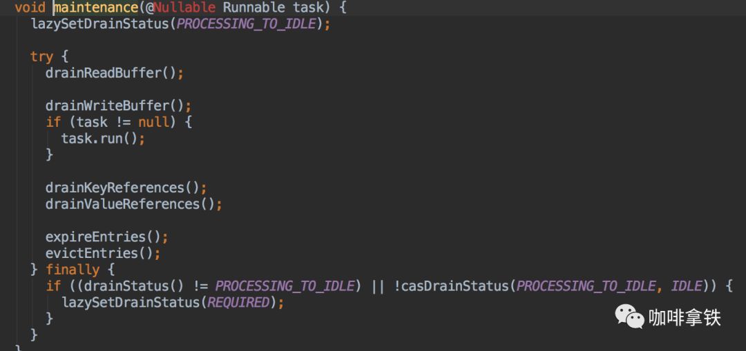 在Caffeine中有个scheduleDrainBuffers方法,用来进行我们的过期任务的调度,在我们读写之后都会对其进行调用: