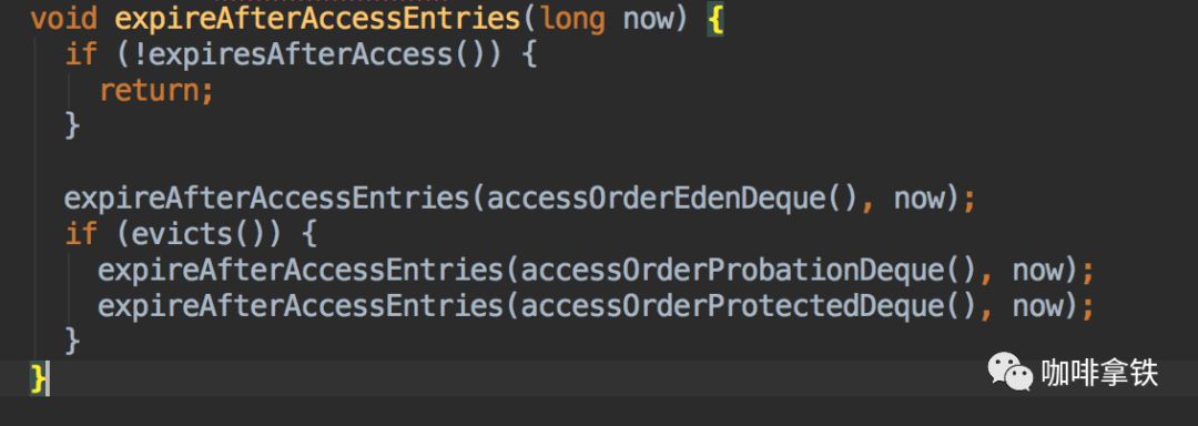 这里根据我们的配置evicts()方法为true,所以会从三个队列都进行过期淘汰,上面已经说过了这三个队列都是LRU队列,所以我们的expireAfterAccessEntries方法,只需要把各个队列的头结点进行判断是否访问过期然后进行剔除即可。