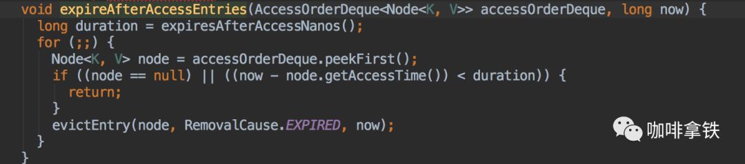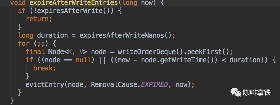 可以看见这里依赖了一个队列writeQrderDeque,这个队列的数据是什么时候填充的呢?当然也是使用异步,具体方法在我们上面的draninWriteBuffer中,他会将我们之前放进RingBuffer的Task拿出来执行,其中也包括添加writeQrderDeque。过期的策略很简单,直接循环弹出第一个判断其是否过期即可。
