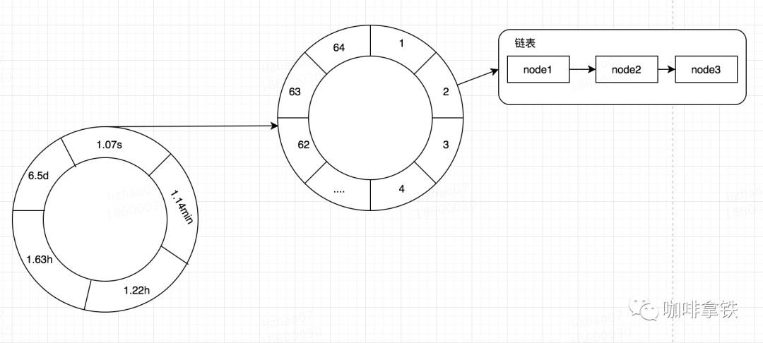 在Caffeine中的时间轮如上面所示。在我们插入数据的时候,根据我们重写的方法计算出他应该过期的时间,比如他应该在1536046571142时间过期,上一次处理过期时间是1536046571100,对其相减则得到42ms,然后将其放入时间轮,由于其小于1.07s,所以直接放入1.07s的位置,以及第二层的某个位置(需要经过一定的算法算出),使用尾插法插入链表。