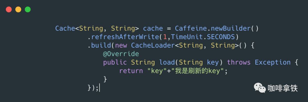 Caffeine提供了refreshAfterWrite()方法来让我们进行写后多久更新策略: