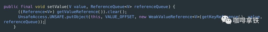 在Caffeine中支持弱引用的淘汰策略,其中有两个api: weakKeys()和weakValues(),用来设置key是弱引用还是value是弱引用。具体原理是在put的时候将key和value用虚引用进行包装并绑定至引用队列: