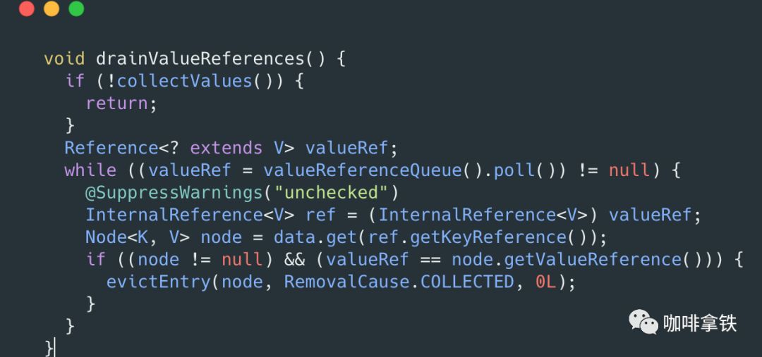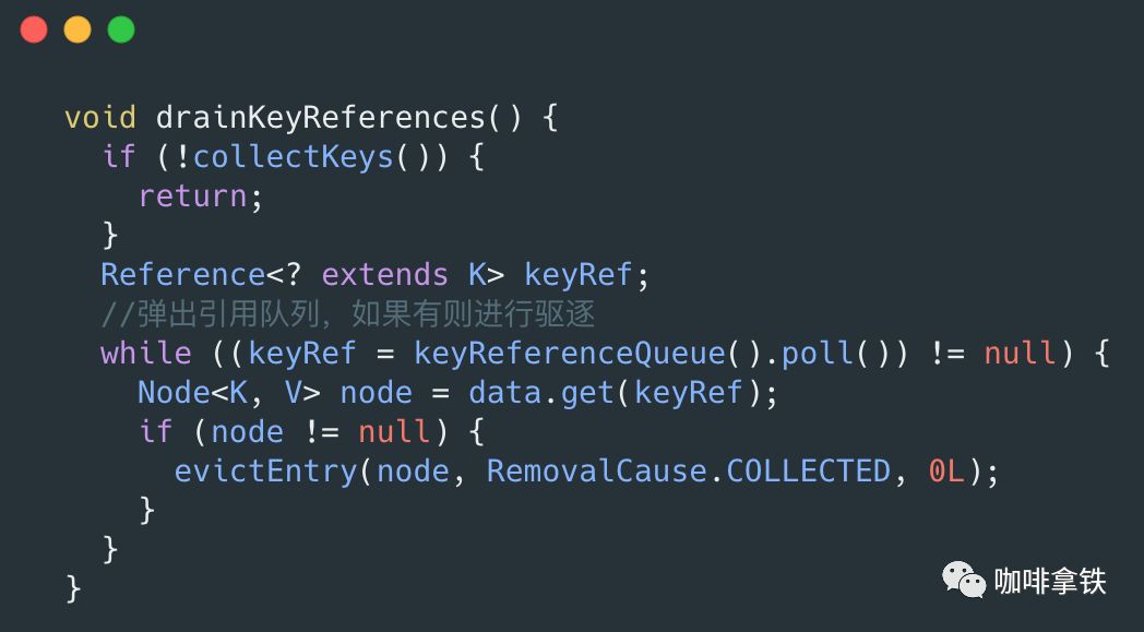 因为我们的key已经被回收了,然后他会进入引用队列,通过这个引用队列,一直弹出到他为空为止。我们能根据这个队列中的运用获取到Node,然后对其进行驱逐。
