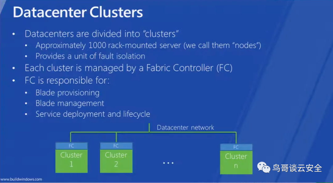 每一个Cluster集群都会通过Fabric Controller来进行管理,Fabric Controller的主要职责和Azure的服务生命周期管理、Azure虚拟机生命周期的管理、Azure数据中心物理服务器的监控状态管理、Azure云进行Scale-Out扩展的时候进行服务器的扩容管理等等、Fabric Controller会管理Azure硬件服务器的部署和使用,并且最终完成Azure服务部署和管理应用生命周期的核心云内核核心。