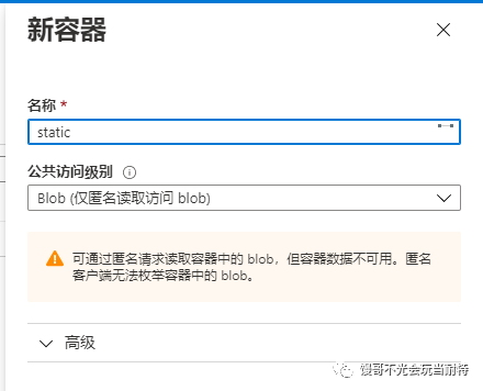 回到Azure Blob资源主界面开始新建容器,取个名字“static”,公共访问级别选择“Blob仅匿名访问blob”。