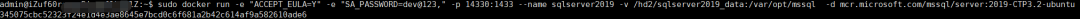 sudo docker run -e "ACCEPT_EULA=Y" -e "SA_PASSWORD=dev@123," -p 14330:1433 --name sqlserver2019 -v /hd2/sqlserver2019_data:/var/opt/mssql -d mcr.microsoft.com/mssql/server:2019-CTP3.2-ubuntu