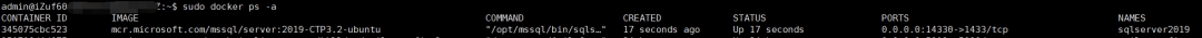 使用docker ps 命令查看容器运行情况,可以看到sqlserver2019正在运行